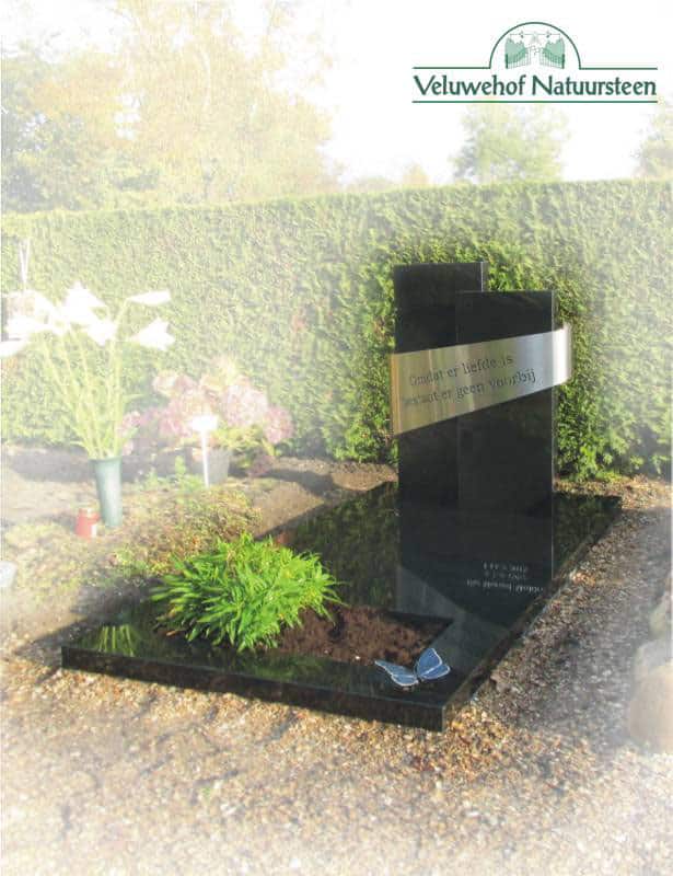 Grafmonument bestaande uit een grondplaat van zwart graniet met 2 zuilen van zwart graniet. De zuilen zijn verbonden met een RVS band.