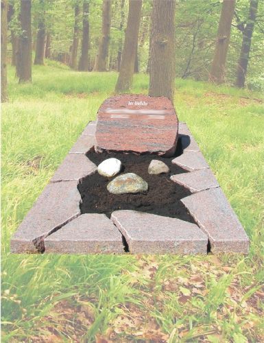 Grafsteen bestaande uit een doorgezaagde zwerfkei, de gezaagde zijde is gepolijst, omranding van granieten flagstones.
