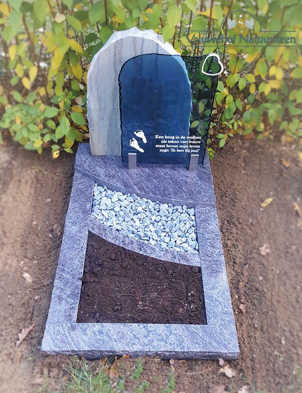 Een kindermonument bestaande uit een toog gemaakt van Azul Macauba.Hiervoor is een blauwe glasplaat van 12 mm met een geknabbelde rand geplaatst, die bevestigd is met RVS houders. De glasplaat is voorzien van gezandstraalde inscripties en teksten. De omranding is gemaakt van gezoet Orion graniet waarvan de buitenrand gehakt is. Binnenin is een golvende/rondlopende tuinstrook. De binnenruimte is gevuld met Ice Blue split en Azul Macauba edelsplit.