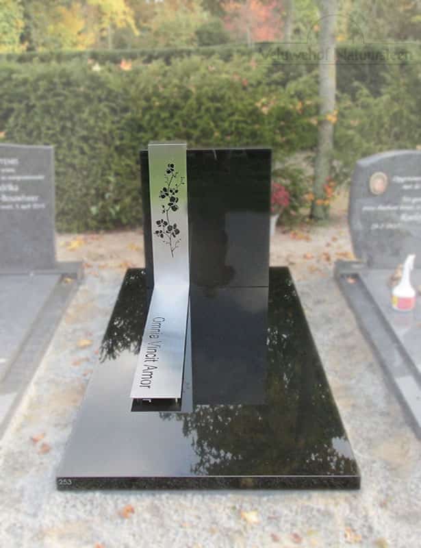 Zeer strakke en moderne grafsteen gemaakt van zwart graniet. Bestaande uit zwarte letterplaat en onderplaat. Met een zeer mooie rvs detail over de onderplaat en tekstplaat met tekst en bloem uitsneden.