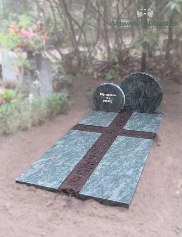 Grafmonument met 2 cirkels als letterplaat. Gemaakt van gepolijst olive green graniet. Ook de grondplaat is hiervan gemaakt en heeft een tuinuitsparing in de vorm van een kruis.