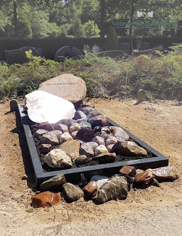 Grafmonument gemaakt van een doorgezaagde zwerfkei. De twee delen zijn gepolijst en van tekst voorzien. De omranding is gemaakt van gebrand royal impala graniet. Deze is opgevuld met diverse soorten maaskeien.
