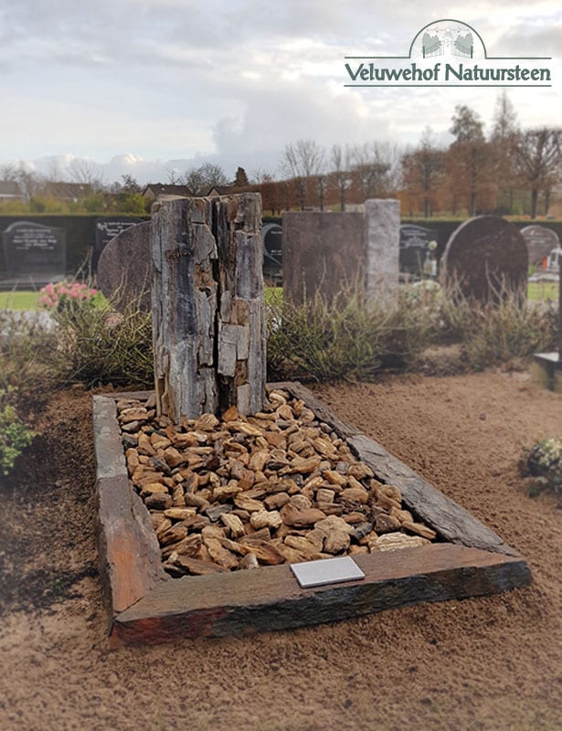 Gedenksteen gemaakt van versteend hout en een omranding van losse stukken monoliet. De binnenruimte is gevuld met kleinere stukken versteend hout. Op de omranding is een bronzen, wit gepatineerde tekstplaat bevestigd. Op het versteende hout is de naam in ´eigen´ handschrift gemaakt, van het brons, op de steen bevestigd.