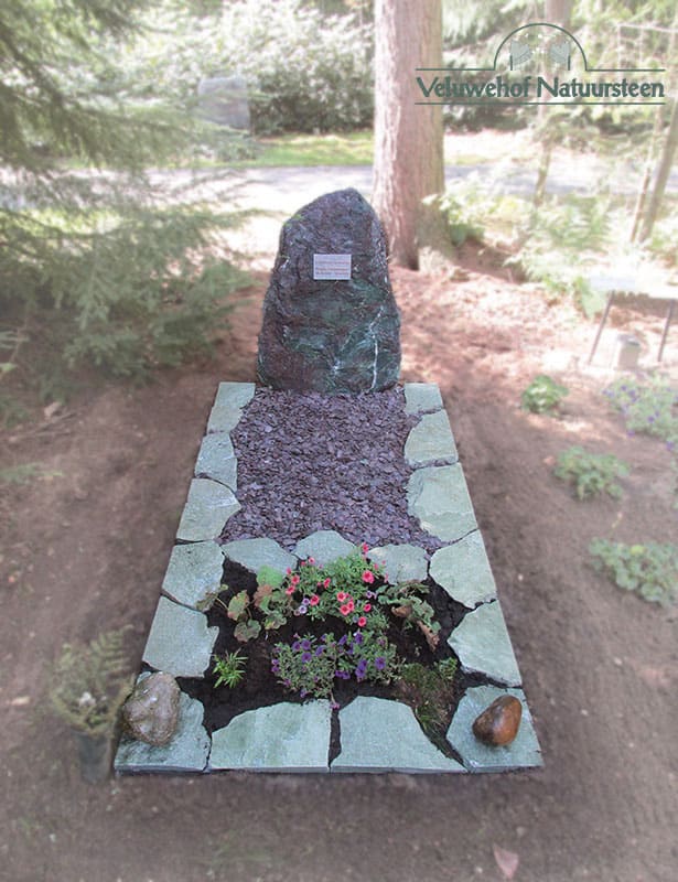 Grafsteen met letterplaat van een ruwe steen Verde Alverso met een bronzen tekstplaatje dit wit gepatineerd is. Ook de omranding is gemaakt van de steensoort Verde Alverso. Met tuinstrook en extra decoratieve keien vooraan het monument. In overige gedeelte van omranding zijn houtsnippers geplaatst.