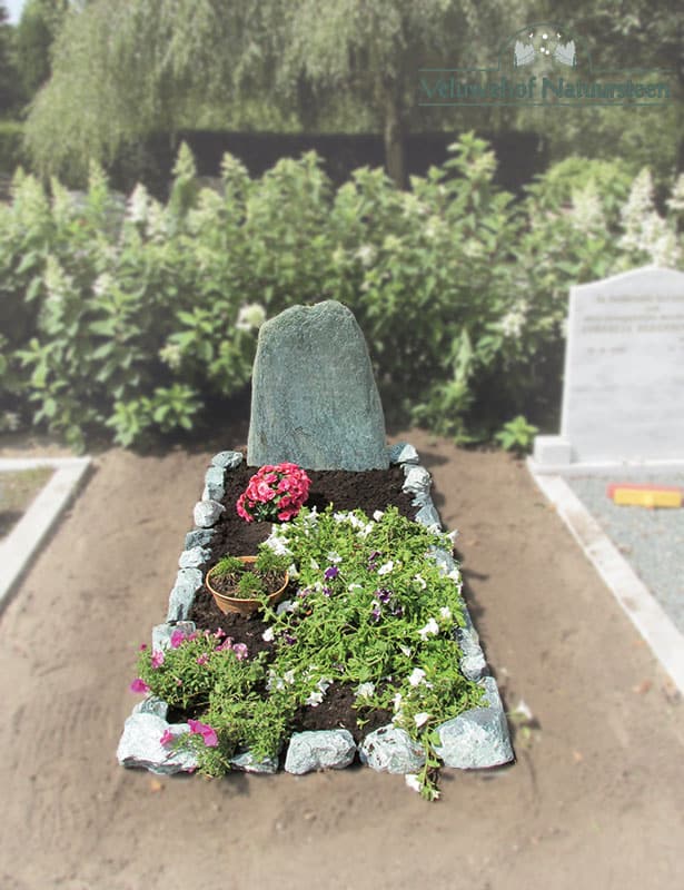 Grafmonument met een ruwe steen Verde Alverso met een getrommeld oppervlakte. De omranding is ook gemaakt van Verde Alverso keien. Binnenruimte gevuld met potgrond en dient als natuurlijke tuin.