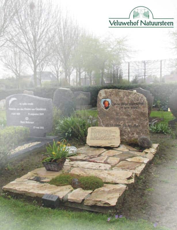 Ruwe grafsteen waarbij de onderplaat is dichtgelegd met flagstones.