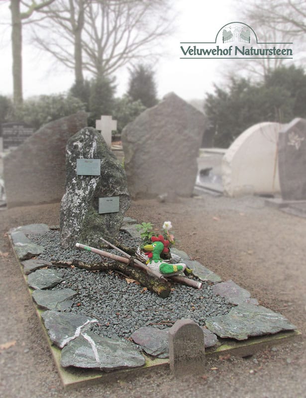 Grafmonument bestaande uit een ruwe natuursteen Verde Alverso. De omranding is gemaakt van flagstones en opgevuld met split. Op de ruwe steen zijn twee tekstplaatjes geplaatst, die gemaakt zijn van brons.