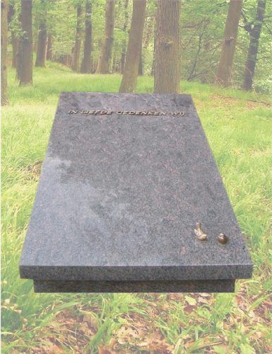 De grafzerk is vervaardigd uit Himalaya graniet met vogeltjes van brons, de opschrift bestaat uit bronzen letters.